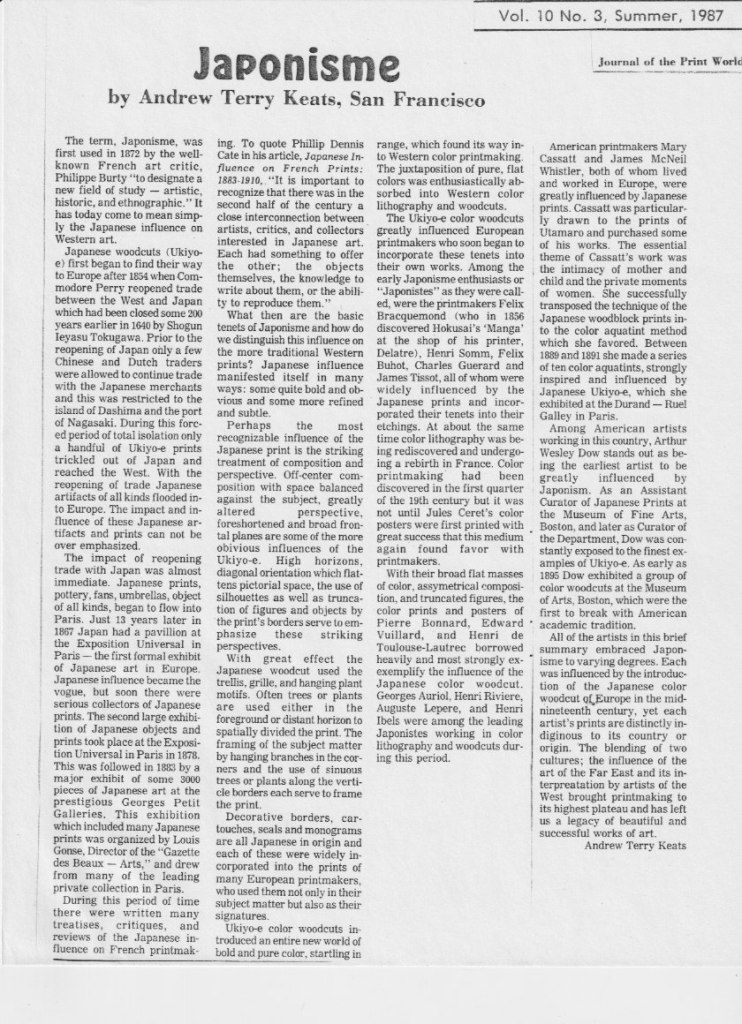 The article “Japonisme” was originally published in The Journal of the Print World in the summer of 1987. Since then there have been many museum exhibitions and books published on the subject.